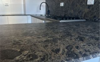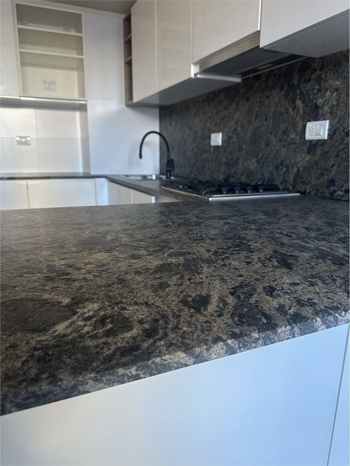 . Muebles de cocina con bajo mesada y alacena, mesadas negro Brasil; hornos y anafes marca Longvie o similar y pileta de acero  marca Johnson con monocomando.